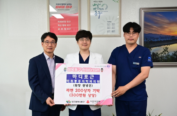 [고타야뉴스=이은희기자]마디포근마취통증의학과의원(원장 권녕건)은 지난 2일, 동구 내 저소득 가정을 위해 라면 200상자(300만원 상당)를 동구에 기탁했다. 기탁받은 물품은 동구 관내 저소득 세대에 전달될 예정이다.