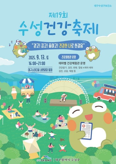 [고타야뉴스=이은희기자]대구 수성구에서 주최하는 `제19회 수성건강축제`가 오는 13일 오후 4시부터 9시까지 대구스타디움 서편광장 일대에서 개최된다.