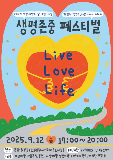 [고타야뉴스=손창범기자] 포항시 남·북구보건소는 오는 12일 오후 5시, 포항철길숲(오크정원~기후대응도시숲)에서 자살예방의 날을 기념해 생명존중 페스티벌 ‘Live, Love, Life’를 개최한다.