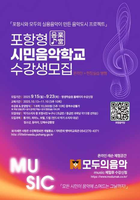 이는 자기계발과 취미활동으로 삶의 질을 향상시키고, 민관 협력형 평생교육 모델을 구축해 “음악이 흐르는 도시, 포항” 이미지 정착에도 기여할 것으로 기대된다.