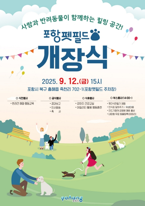 이강덕 포항시장은 “반려견과 함께하는 시민이 늘어나는 추세에 맞춰 포항펫필드를 조성했다”며 “앞으로도 시민과 반려견이 안전하고 행복하게 어울릴 수 있는 공간으로 발전시켜 나가겠다”고 전했다.