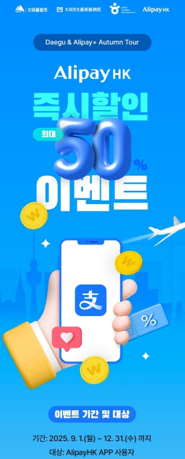강성길 대구문화예술진흥원 관광본부장은 “이번 간편결제 인프라 구축과 알리페이HK 프로모션은 중화권 관광객 유치 확대와 지역 상권에도 실질적인 파급효과를 가져올 것”이라며, “앞으로도 민간 플랫폼과의 전략적 협력을 통해 글로벌 관광 수요에 대응하는 스마트 관광환경을 지속적으로 조성해 나가겠다”고 말했다.