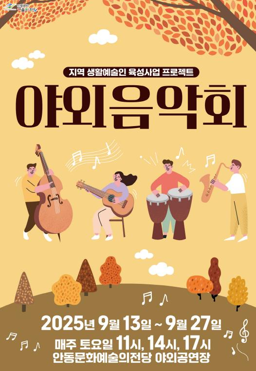 [고타야뉴스=박동수기자]안동문화예술의전당은 오는 9월 13일을 시작으로, 3주간에 걸쳐 지역 생활예술인 육성지원 사업 ‘2025년 안동문화예술의전당 야외음악회’를 안동문화예술의전당 야외공연장에서 무료로 개최한다.
