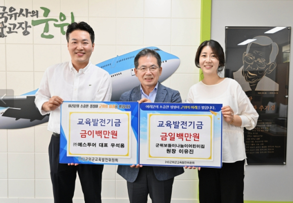 [고타야뉴스=이은희기자] (사)군위군교육발전위원회 이사로 활동 중인 ㈜예스투어 우석용 대표와 부인인 군위보듬이나눔이어린이집 이유진 원장이 지난 3일 군위군청을 방문해 지역의 교육 발전과 인재양성을 위해 써달라며 각각 200만 원과 100만 원의 교육발전기금을 기탁했다.