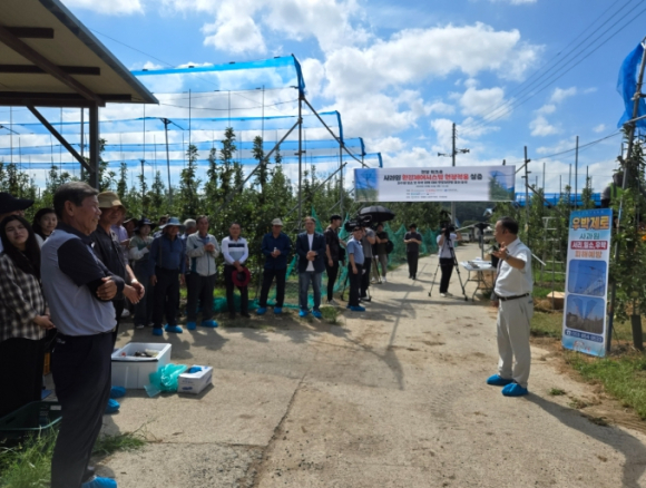 2025년 9월 4일 오전 10시 30분, 군위군 군위읍 햇빛차단망 설치농가에서 경북사과수출농업기술지원단(단장:경북대학교 강인규 교수)이 주최하고 한국농업기술진흥원, 경상북도농업기술원이 주관한 ‘다목적 햇빛차단망 보급사업 현장워크숍`이 개최됐다.