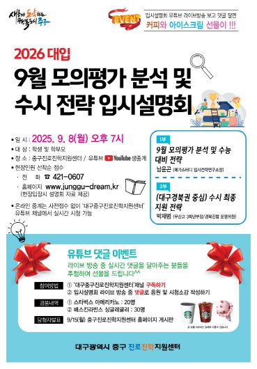 | ↑↑ 대구 중구진로진학지원센터, 9월 모의평가 분석 및 대입 전략 입시설명회 개최(포스터) |