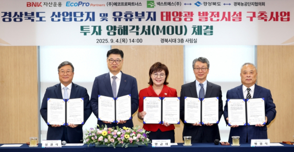 [고타야뉴스=이은희기자]경상북도는 4일 도청에서 BNK자산운용㈜, ㈜에코프로파트너스, 넥스트에스㈜, 경북농공단지협의회와 함께 ‘산업단지 및 유휴부지 태양광 발전시설 구축사업’을 위한 공동협력 및 투자 양해각서(MOU)를 체결했다.