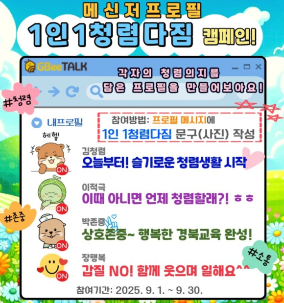 [고타야뉴스=이은희기자]경북교육청은 9월 한달 간 쉽고 즐겁게 참여할 수 있는 ‘메신저 프로필 `1인·1청렴다짐` 캠페인’을 실시한다고 8일 밝혔다.