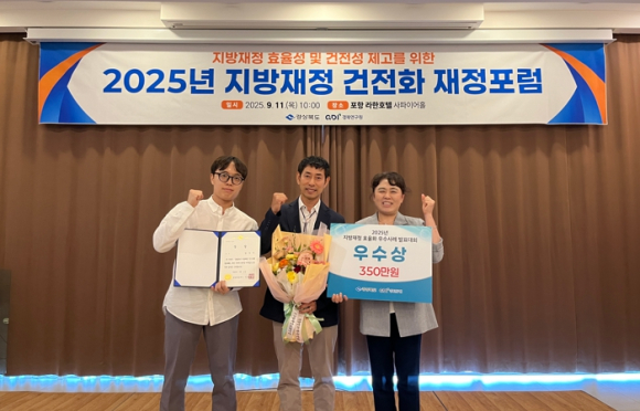 | ↑↑ 11일 포항 한화호텔에서 열린 ‘2025년 지방재정 효율화 우수사례 발표대회’에서 경주시 농업기술센터 이승찬 경제작물팀장(가운데)이 우수상을 수상한 뒤 기념촬영을 하고 있다. |