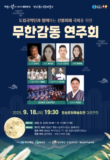 [고타야뉴스=박현미기자]청송군은 오는 9월 18일 오후 7시 30분, 청송문화예술회관 대공연장에서 ‘도립국악단과 함께하는 산불 피해 극복을 위한 무한감동 연주회’를 개최한다.