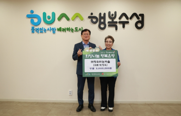 [고타야뉴스=이은희기자]대구 수성구는 15일 자활기업 ㈜청소하는마을(대표 박정옥)이 관내 어려운 이웃들을 위해 성금 300만 원을 전달했다고 밝혔다.
