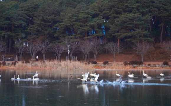 한겨울, 물살을 가르며 비상하는 고니의 모습이 고요한 연호공원에 생동감을 더하며 대한민국의 숨결을 고스란히 전하고 있다.