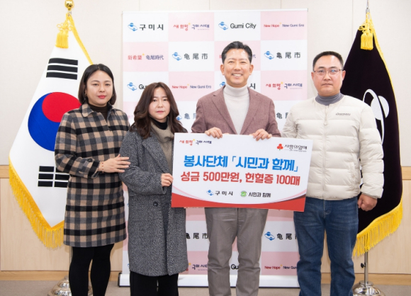 [고타야뉴스=이은희기자]구미시는 지난 24일 봉사단체 시민과함께(대표 이상혁)로부터 이웃돕기성금 500만원과 헌혈증 100매를 기탁받았다.