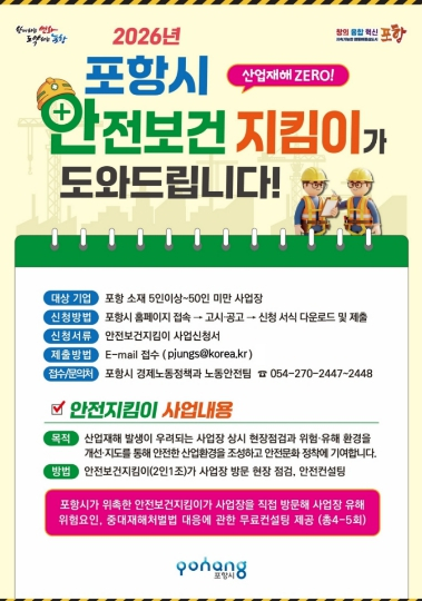 한편, 안전보건지킴이 현장 점검 및 컨설팅 지원을 희망하는 사업장은 포항시 홈페이지 고시·공고란에서 ‘2026년 포항시 관내 소규모 사업장 안전보건지킴이 사업장 모집 공고’를 확인하거나, 포항시 경제노동정책과 노동안전팀으로 문의하면 된다.