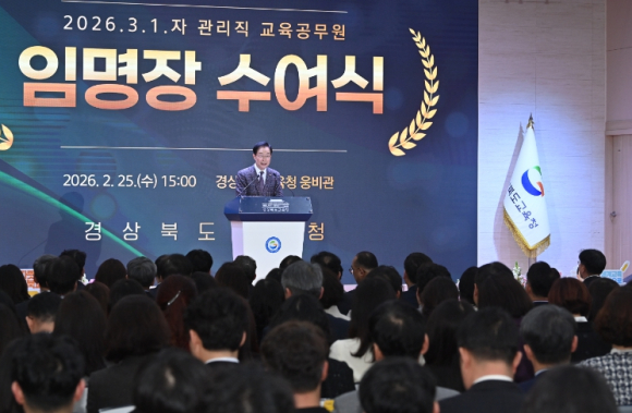 [고타야뉴스=이은희기자] 경북교육청은 25일 본청 웅비관에서 2026년 3월 1일 자로 신규 임용되는 유․초․중등 관리직 교육공무원에게 임명장을 수여했다고 밝혔다.