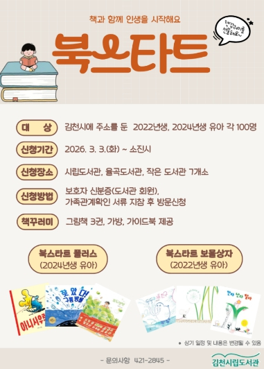 [고타야뉴스=이은희기자]김천시립도서관(관장 이신기)은 오는 3월 3일부터 관내에 주소를 둔 유아들에게 생애 처음 책꾸러미를 선물하는 `북스타트`를 운영한다.