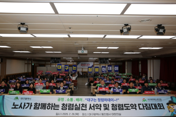 [고타야뉴스=이은희기자] 대구광역시는 2월 26일 ‘노사가 협력해 공직을 혁신한다’는 목표 아래 공직사회 청렴문화 확산과 실천 의지를 표명하기 위해, 대구공무원노동조합과 공동으로 ‘노사가 함께하는 청렴실천 서약 및 청렴도약 다짐대회’를 개최했다.