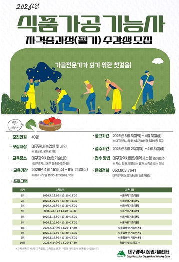 | ↑↑ 대구농업기술센터, ‘식품가공기능사 자격증 과정(필기) 교육’ 수강생 모집 |
