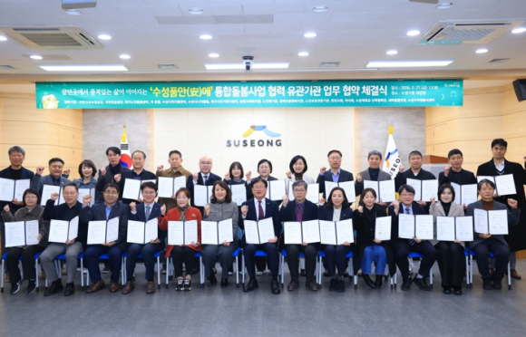 [고타야뉴스=이은희기자]대구 수성구는 지난 27일 구청 대강당에서 ‘수성품안(安)에’ 통합돌봄 사업의 안정적 추진을 위해 관내 27개 유관 기관과 업무협약을 체결하고, 민관 협력 기반의 지역 통합돌봄 체계 구축에 본격 나섰다.