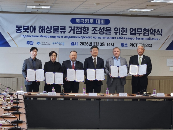 [고타야뉴스=이은희기자]경상북도는 2026년 3월 3일 포항영일신항만 주식회사(PICT) 대회의실에서 북극항로 시대를 대비해 영일만항이 동북아 해상물류 거점항만으로 발돋움하기 위한 다자간 업무협약을 체결했다.