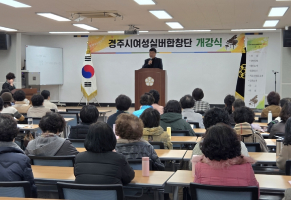 | ↑↑ 경주시여성실버합창단 가곡반이 3일 경주문화원 강당에서 2026년 개강식을 개최한 가운데, 윤철용 경주시 시민복지국장이 인사말을 전하고 있다 |