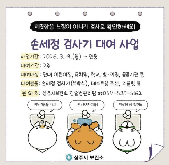 [고타야뉴스=이은희기자]상주시보건소는 지역 어린이집, 유치원, 학교, 공공기관 등을 대상으로 올바른 손씻기 습관 형성과 감염병 예방을 위한 ‘손세정 검사기 대여 서비스’를 3월부터 연중 운영한다고 밝혔다.