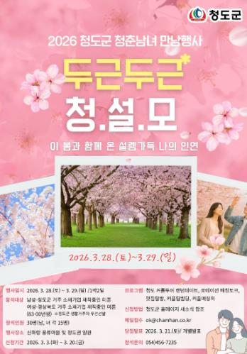 [고타야뉴스=이은희기자]경북 청도군은 다가오는 봄을 맞아 바쁜 직장 생활로 인연을 만날 기회가 부족했던 청년들을 위해, 아름다운 청도 관광 명소를 여행하며 자연스럽게 인연을 찾는 미혼남녀 만남행사‘청(도)설(렘)모(임) 프로젝트’를 개최하고 참가자를 모집한다고 밝혔다.
