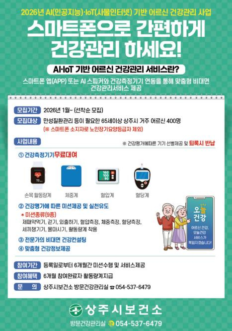 [고타야뉴스=이은희기자]상주시보건소는 지역 어르신의 만성질환 예방과 건강생활 실천을 돕기 위해 녪년 AI·IoT 기반 어르신 건강관리사업’참여자를 3월 말까지 선착순으로 모집한다.