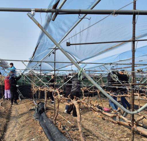 | ↑↑ 9일 영천시 공무원들이 습설 피해 포도 농가에서 비가림 시설 비닐 복구 작업을 하고 있다. |
