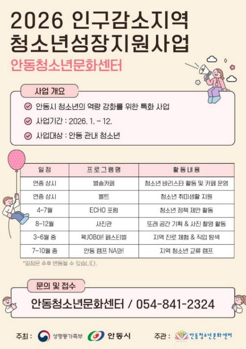 [고타야뉴스=박동수기자]성평등가족부와 안동시가 지원하고 안동청소년문화센터가 주관하는 ‘2026 인구감소지역 청소년성장지원’ 사업이 지난해에 이어 2년 연속 운영된다.
