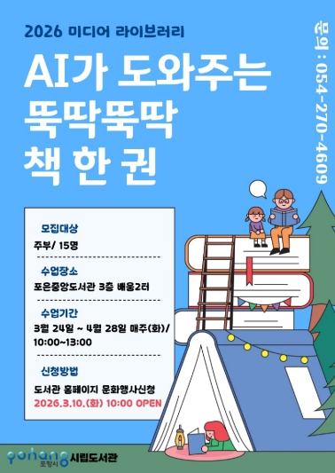 [고타야뉴스=손창범기자] 포항시립포은중앙도서관은 오는 24일부터 4월 28일까지 매주 화요일, 포은중앙도서관 배움2터에서 ‘2026 상반기 별찌인문교실’과 ‘미디어라이브러리’ 수업을 운영한다.