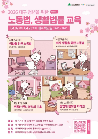 [고타야뉴스=이은희기자]대구광역시는 지역 청년들의 노동권 보호와 법적 권리 인식 제고를 위해 ‘대구 청년을 위한 노동법·생활법률 교육’을 오는 4월부터 본격 추진한다.