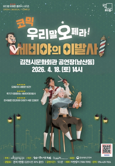 [고타야뉴스=이은희기자] 김천시 문화예술회관은 온 가족이 함께 웃으며 즐길 수 있는 우리말 코믹 오페라 `세비야의 이발사`를 오는 4월 18일, 김천시문화회관(남산동)에서 개최한다.
