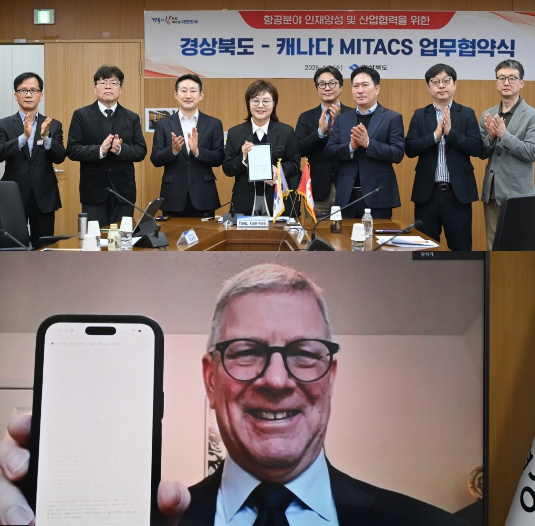 [고타야뉴스=이은희기자]경상북도는 1일 도청에서 양금희 경제부지사와 Mitacs 대표 스티븐 루카스(Stephen Lucas), 대학 관계자 등이 화상으로 참석한 가운데 캐나다 비영리 연구 협력기관인 Mitacs(마이탁스)와 업무협약을 체결하고, 항공 분야 청년 인재 양성 및 산·학·연 연계 산업 협력을 모색하기로 했다.