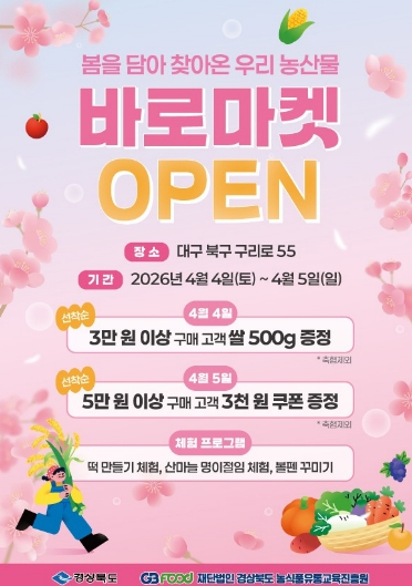 [고타야뉴스=이은희기자] 경상북도는 오는 4월 4일부터 12월 6일까지 매주 토․일요일 오전 9시부터 오후 5시까지 대구시 북구 구리로에 위치한 경상북도 농업자원관리원에서 바로마켓 경상북도점을 운영한다고 밝혔다.