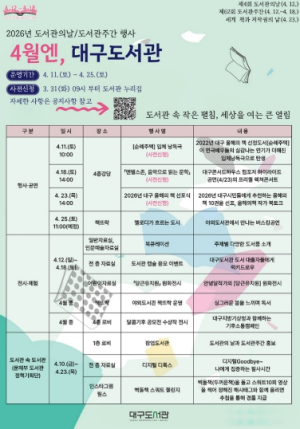 권현주 대구도서관장은 “4월 다채로운 도서관 행사를 통해 시민들이 일상에서 자연스럽게 독서를 즐기고, 도서관이 시민 삶에 활력과 희망을 불어넣은 공간으로 자리매김하도록 노력하겠다”고 말했다.
