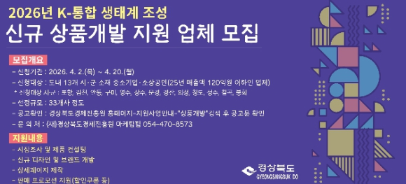 [고타야뉴스=이은희기자] 경상북도는 도내 유망 중소기업·소상공인의 제품 경쟁력 강화를 위해 ‘2026년 K-통합 마케팅 생태계 조성사업’의 일환으로 상품 기획부터 디자인·마케팅까지 전 과정을 지원하는‘신규 상품개발 지원사업’에 참여할 기업을 모집한다.
