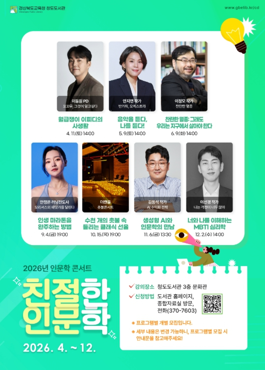 [고타야뉴스=이은희기자] 경상북도교육청 청도도서관은 2026년 인문학 콘서트 ‘친절한 인문학’을 4월부터 12월까지 총 7회에 걸쳐 운영한다고 밝혔다.