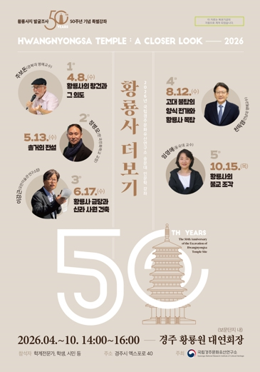 [고타야뉴스=이은희기자]경주시는 국립경주문화유산연구소가 황룡사지 발굴조사 50주년을 맞아 오는 4월 8일부터 10월 15일까지 경주 보문단지 내 황룡원에서 2026년 숭문대 인문학 강좌 `황룡사 더보기`를 개최한다고 밝혔다.