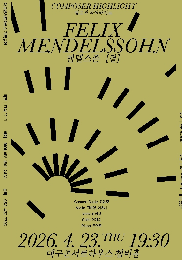 [고타야뉴스=이은희기자] 대구문화예술진흥원 대구콘서트하우스는 4월 23일 오후 7시 30분, 챔버홀에서 ‘컴포저 하이라이트 : 멘델스존, 결’을 개최한다.
