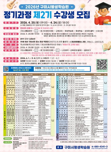 수강 신청은 19세 이상 구미시민 또는 관내 직장 재직자를 대상으로 하며, ‘구미시통합예약’ 포털에서 인터넷 접수 후 전산 추첨으로 선발한다. 원활한 신청을 위해 과정별로 5일간 순차 접수를 진행할 예정이다.