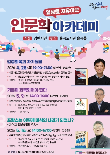 [고타야뉴스=이은희기자]김천시립율곡도서관(관장 이신기)은 시민들의 정서적 회복과 인문학적 소양 함양을 위해 오는 4월 28일부터 `일상을 치유하는 인문학 아카데미`를 운영하고 참가자를 모집한다고 밝혔다.