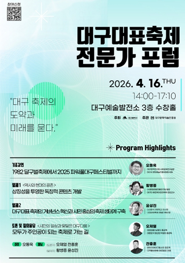 [고타야뉴스=이은희기자] 대구광역시는 4월 16일 오후 2시 대구예술발전소 수창홀에서 지역 대표 축제의 정체성을 재정립하고 미래 방향을 설정하기 위한 전문가 포럼을 개최하며 축제 혁신 프로젝트의 본격적인 추진에 나선다.