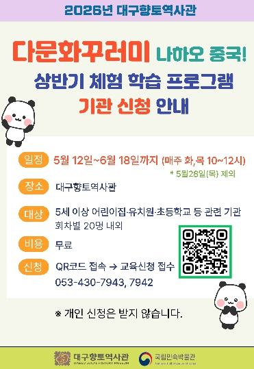 [고타야뉴스=이은희기자] 대구문화예술진흥원 박물관운영본부 소속 대구향토역사관에서는 5월 12일부터 6월 18일까지 매주 화·목요일 10시~12시에 중국 다문화꾸러미 체험학습을 11회 운영하며, 4월 15일부터 어린이집·유치원 등 참여 기관을 모집한다.