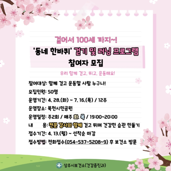 [고타야뉴스=유영우기자]상주시보건소는 지역주민의 신체활동 증진과 건강한 생활습관 형성을 위해‘동네 한바퀴’ 걷기 및 러닝 프로그램을 추진하기 위해 참여자를 모집한다.
