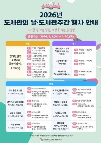 [고타야뉴스=박현미기자]경상북도교육청 봉화도서관은 2026년 도서관의 날·도서관주간을 맞이하여 4월 12일부터 `도서관 속 작은 펼침, 세상을 여는 큰 열림`이라는 주제로 다양한 독서 문화 프로그램을 운영하고 있다.