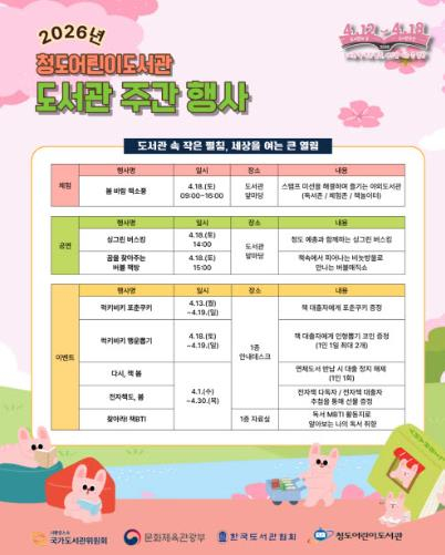 특히, 청도어린이도서관은 색다른 독서경험을 제공하기 위해 야외도서관을 테마로 한 `봄바람 책소풍`을 18일 운영한다.