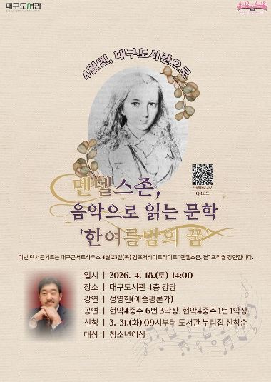 [고타야뉴스=이은희기자] 대구도서관은 4월 도서관 주간을 맞아 대구콘서트하우스와 협업해 특별 렉처콘서트 ‘멘델스존 음악으로 읽는 문학’을 4월 18일 오후 2시에 개최한다.