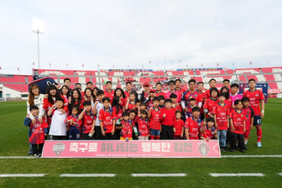 | ↑↑ 4월 12일 7R 안양전 홈경기에서 김천상무 선수들과 플레이어 에스코트 참가자들이 단체사진을 찍고 있다. |