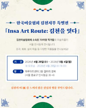 [고타야뉴스=이은희기자]김천시는 4월 29일부터 5월 4일까지 6일간 서울 마루아트센터 2층 갤러리 경북에서 한국미술협회 김천지부 특별전 ‘인사 아트 루트(Insa Art Route): 김천을 잇다’를 개최한다고 밝혔다.